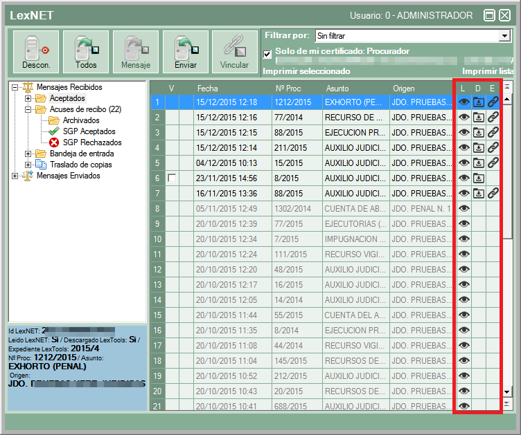 L (leído), D (descargado), E (asociado a un expediente).