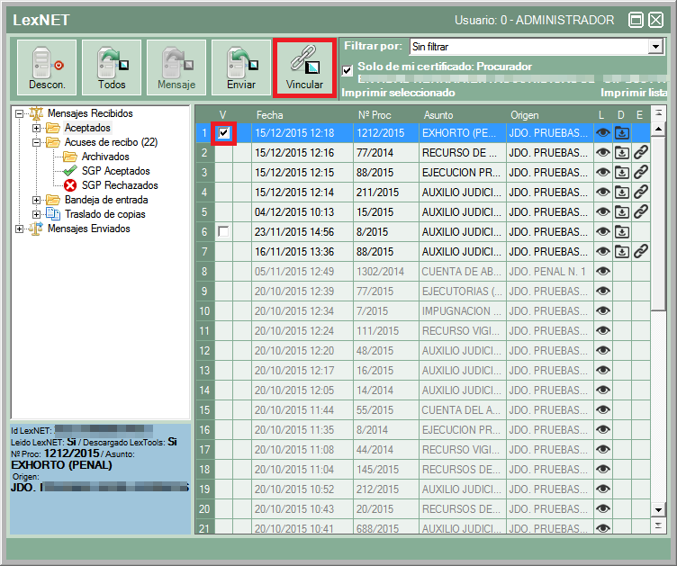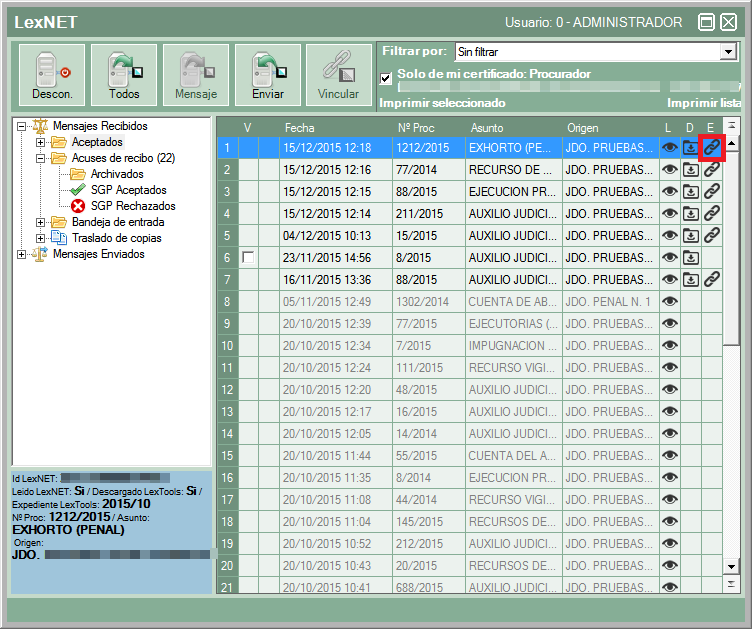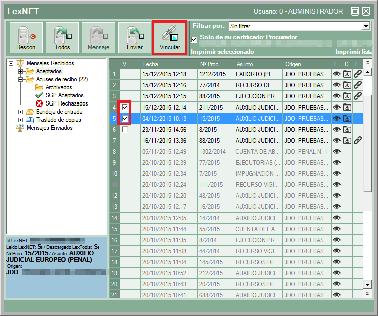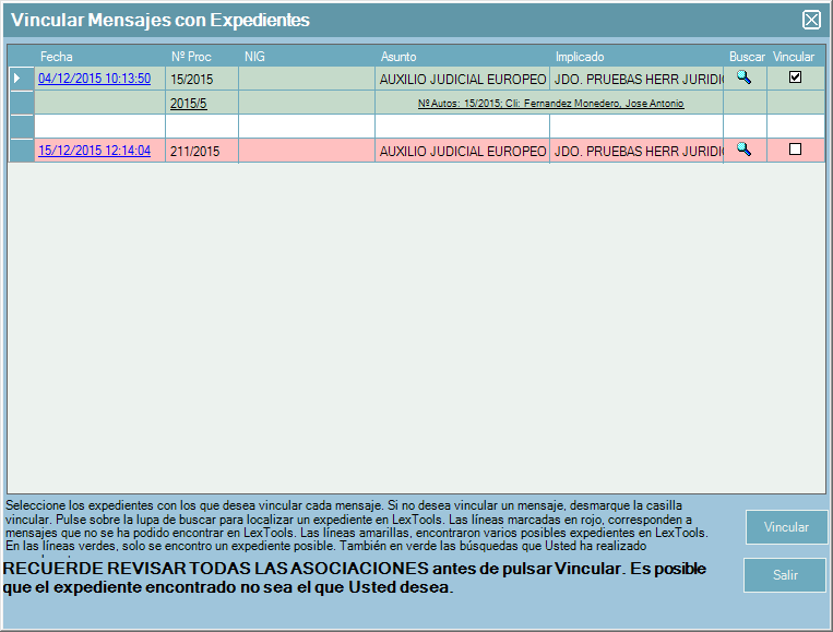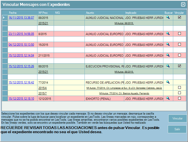 Al pulsar sobre el botón “Vincular” se asociarán automáticamente al expediente las notificaciones en verde, las amarillas y rojas se quedarán sin asociar y se tendrán que vincular desde la bandeja “aceptados”.