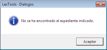 Aparecerá un mensaje indicando que no se ha encontrado el expediente indicado ya que el programa busca automáticamente por número de autos/NIG. Se pincha en “Aceptar”.