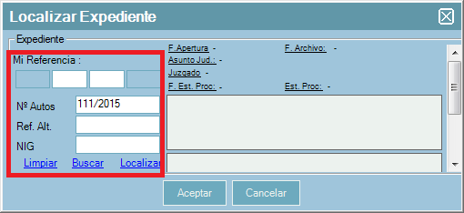 Se podrá buscar el expediente desde la opción “Buscar” o directamente rellenar alguno de los datos y pulsar sobre “Localizar”, acto seguido se pulsa sobre “Aceptar” y volverá a la bandeja “Aceptados” con esa notificación vinculada.