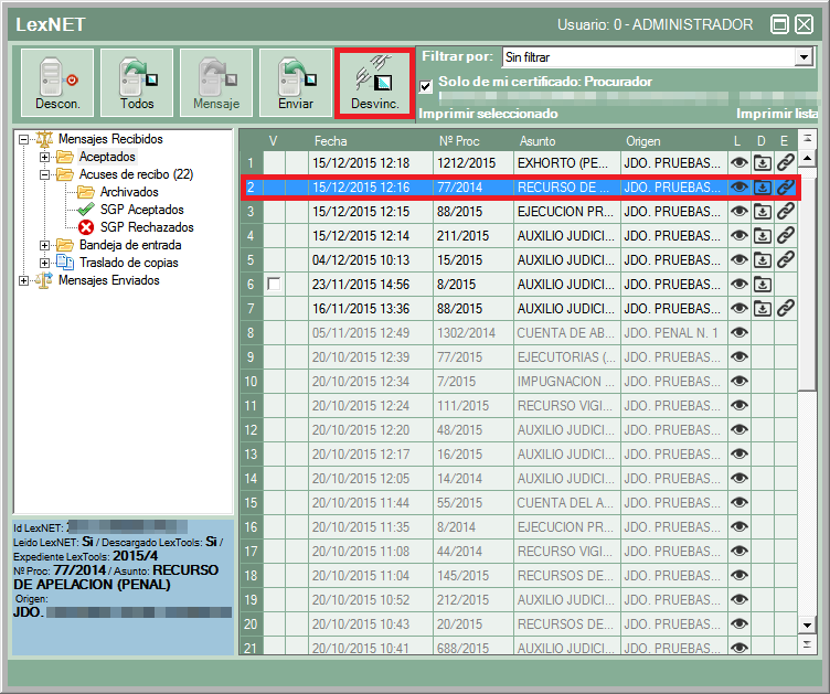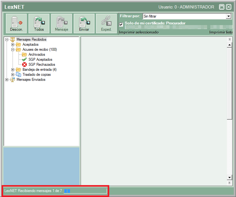 Acto seguido empezará la descarga de los mensajes, pudiéndose ver la barra de progreso en la parte inferior de la ventana. En este mismo proceso el programa realiza una comprobación de los expedientes y cada mensaje mediante primero NIG y después número de autos para realizar la vinculación.