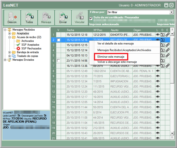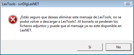 También se pueden eliminar notificaciones ya descargadas pero es importante saber que una vez eliminadas no se podrán volver a descargar desde LexTools, tendrán que descargarlas manualmente desde la web de LexNET siempre y cuando tengan menos de un mes de antigüedad.