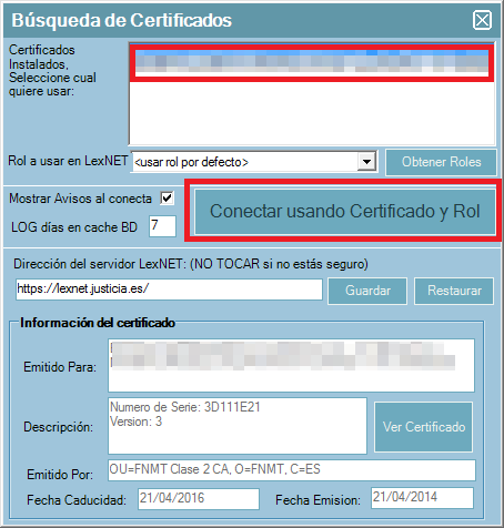 Al pulsar sobre “conectar” aparecerá la ventana de selección de certificados, desde la cual tendrá que seleccionar el certificado con el cual quiere autentificarse en LexNET (en el caso de que tenga más de uno) y pulsar sobre “conectar usando certificado y rol”.