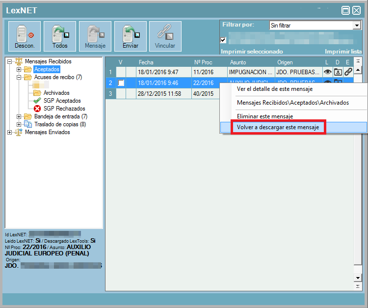 Es posible volver a descargar una notificación, simplemente con la notificación desvinculada pulsar sobre ella con el botón secundario del ratón y pinchar sobre “volver a descargar este mensaje”. Este proceso soluciona problemas como la eliminación de los adjuntos por parte del usuario o una descarga corrupta por problemas de Internet o de los servidores de LexNET.