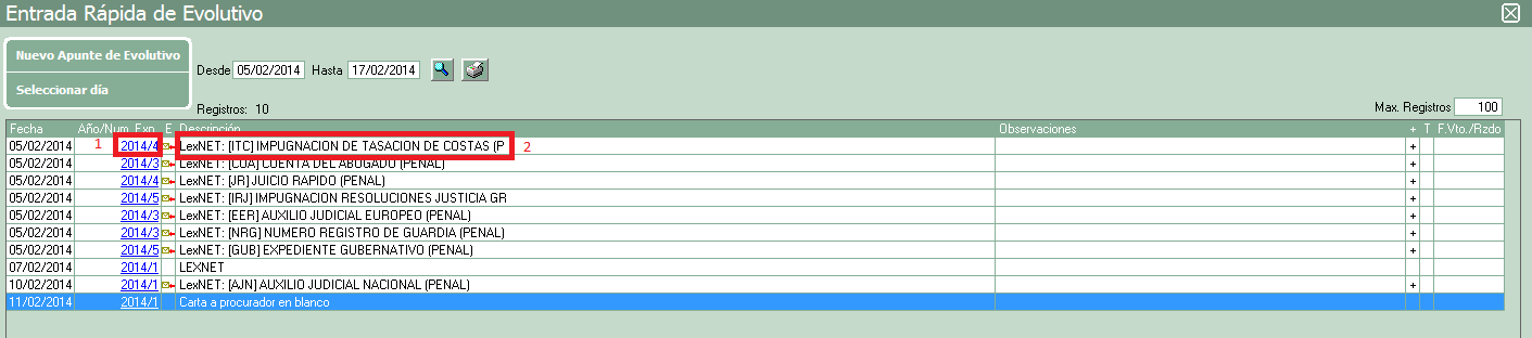 Una vez tengamos todas en pantalla habría dos formas de acceder a ellas, la primera opción sería entrar al expediente de la misma pulsando sobre su número de expediente en la columna “Año/Núm.Exp”, o la segunda pinchar sobre la notificación y se abrirá la línea de evolutivo de la misma.