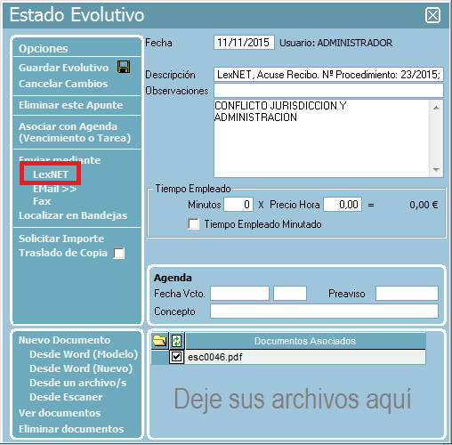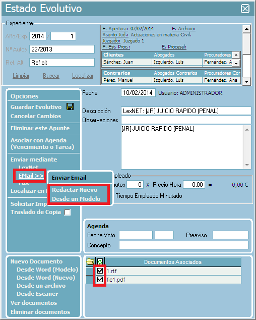 Desde el evolutivo del expediente se puede realizar un envío al juzgado adjuntando los archivos de esa línea.