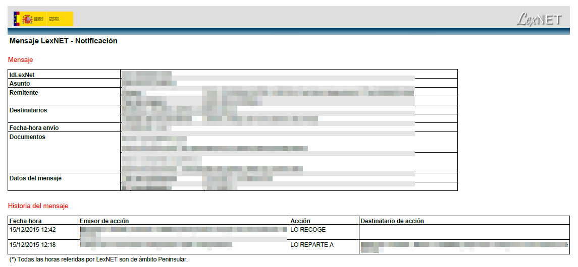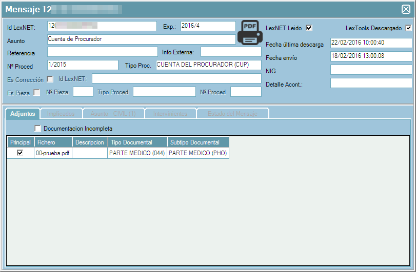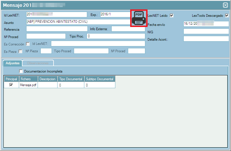 Se puede descargar el archivo PDF del histórico del mensaje, simplemente conectado a LexNET al hacer doble clic sobre un mensaje descargado y vinculado al expediente aparecerán los datos del mensaje y desde el icono marcado en rojo de la captura inferior se puede descargar el archivo del histórico.