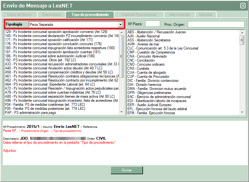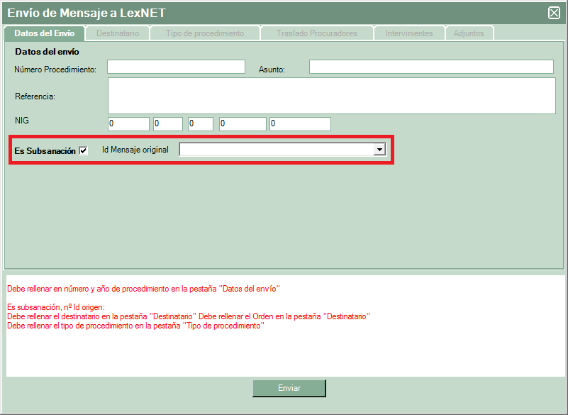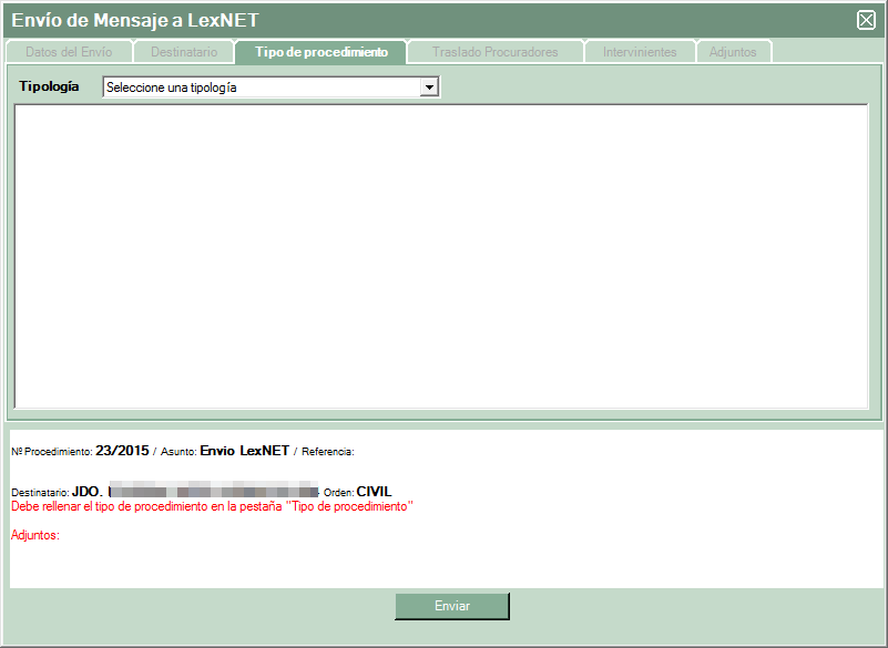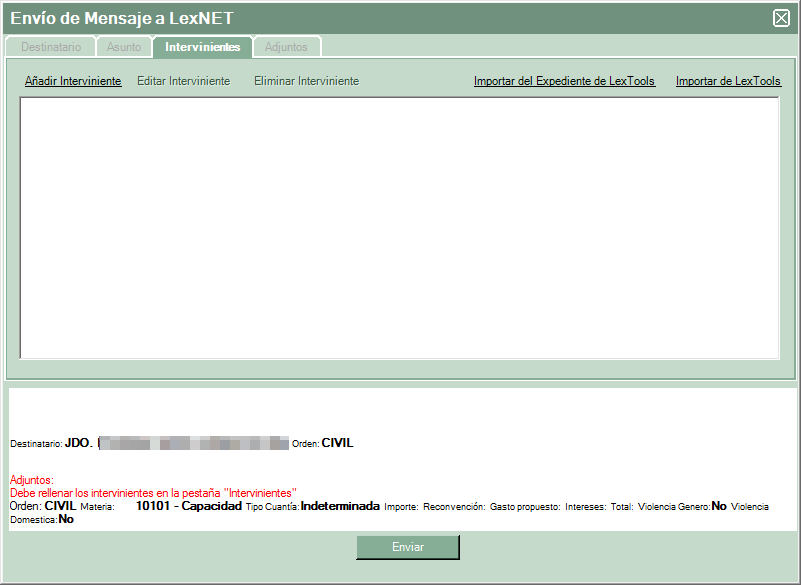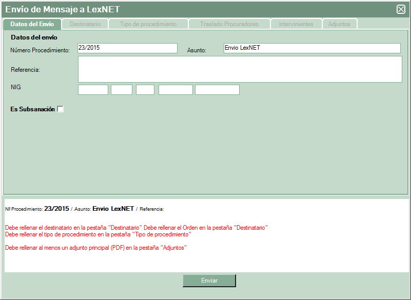 Recordar que los requisitos de envío son los mismos que la web de LexNET ya que los impone el propio servidor, también indicar que de momento no se pueden realizar envíos de personación ni iniciadores de ejecución, ya que se implementaron en la plataforma de LexNET después de nuestra homologación pero estamos trabajanado para implementarlos en LexTools.