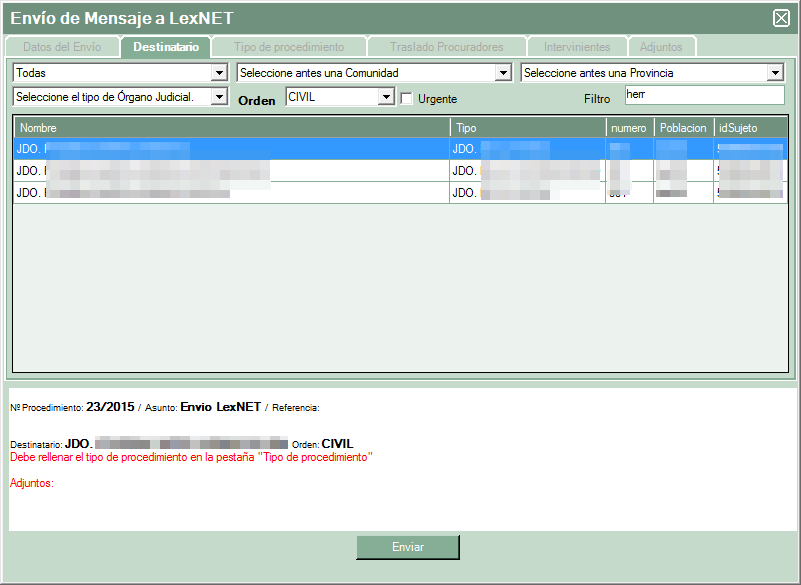 En la ventana “Destinatario” hay que seleccionar el juzgado al que se va a realizar el traslado, en los desplegables de la parte superior se puede filtrar el contenido.