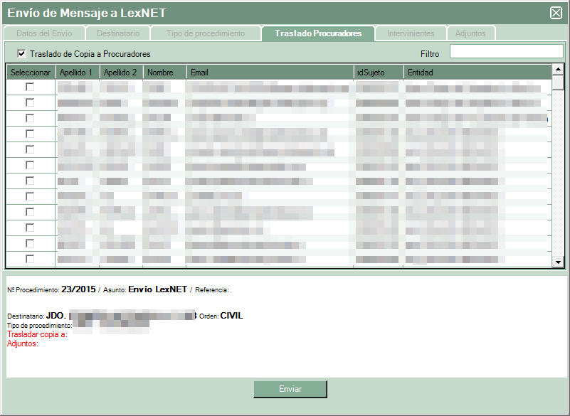 En la próxima pestaña da la opción de traslado de copia al procurador.