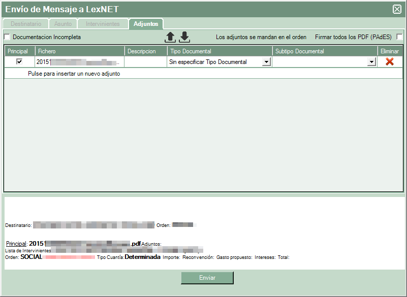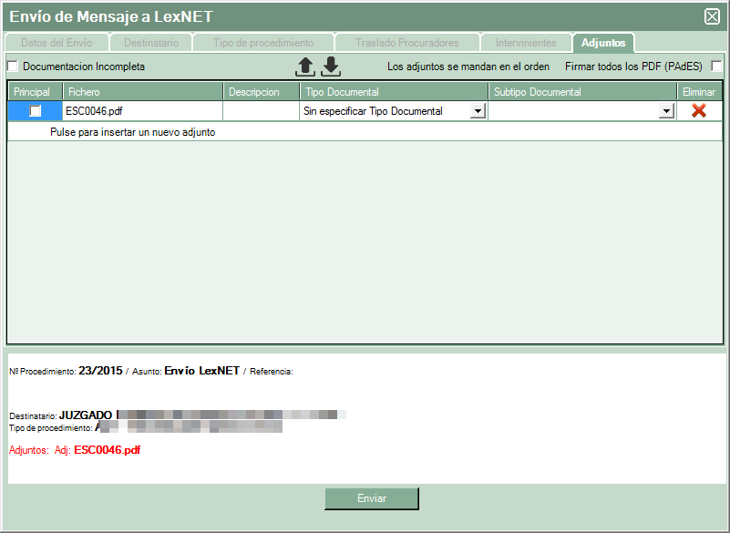En la última pestaña se adjuntan los documentos al envío (aparecerán los seleccionados desde el evolutivo previamente). Debe marcar cuál de ellos es el principal y seleccionar un valor en los campos “tipo documental” y “subtipo documental”. En el caso que se quiera añadir más documentación que no estuviese en el evolutivo se podría seleccionar pinchando sobre “pulse para insertar un nuevo adjunto”.