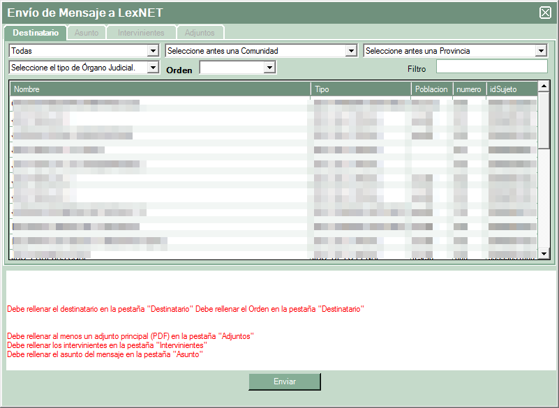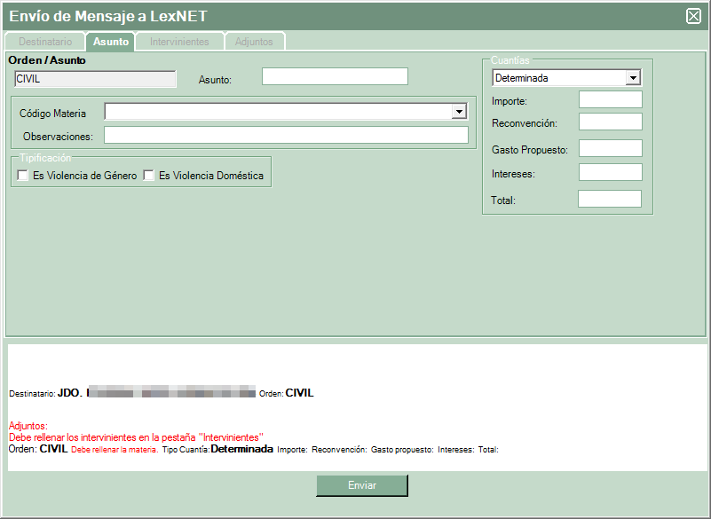 En la parte superior aparecen las pestañas correspondientes a este tipo de envío. La primera sería la selección del juzgado de destino.