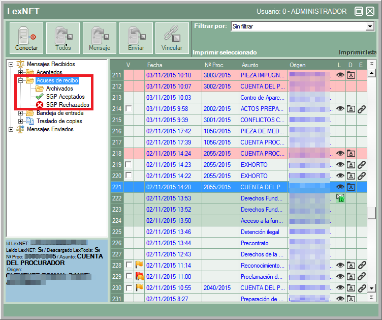 Los acuses de recibo se descargarán en la carpeta “Acuses de recibo”, los acuses aceptados o rechazados no se descargan como mensajes independientes, sino que cambien el color de "blanco" a "verde"/"rojo" (según si se han aceptado o rechazado) dentro de la misma bandeja "acuses de recibo", las carpetas "SGP Aceptados” y “SGP Rechazados” son filtros de ese tipo de la carpeta “Acuses de recibo” para poder verlos agrupados. La actualización de color se lleva a cabo cuando LexTools descarga como mínimo un acuse de recibo nuevo.