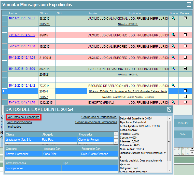 AMARILLO: Se ha encontrado más de un expediente con el mismo número de autos (no tiene NIG), por lo que podrá seleccionar a que expediente de los que aparecen se quiere vincular. Al pulsar sobre la fecha de la línea abre el documento de la notificación (una vez visto el documento debe cerrarlo para que la vinculación se realice correctamente) para poder ver a que expediente corresponde y al pulsar sobre el cliente aparece una ventana con los datos del expediente, si pulsamos sobre “ver datos del expediente” mostrará los datos del mismo.